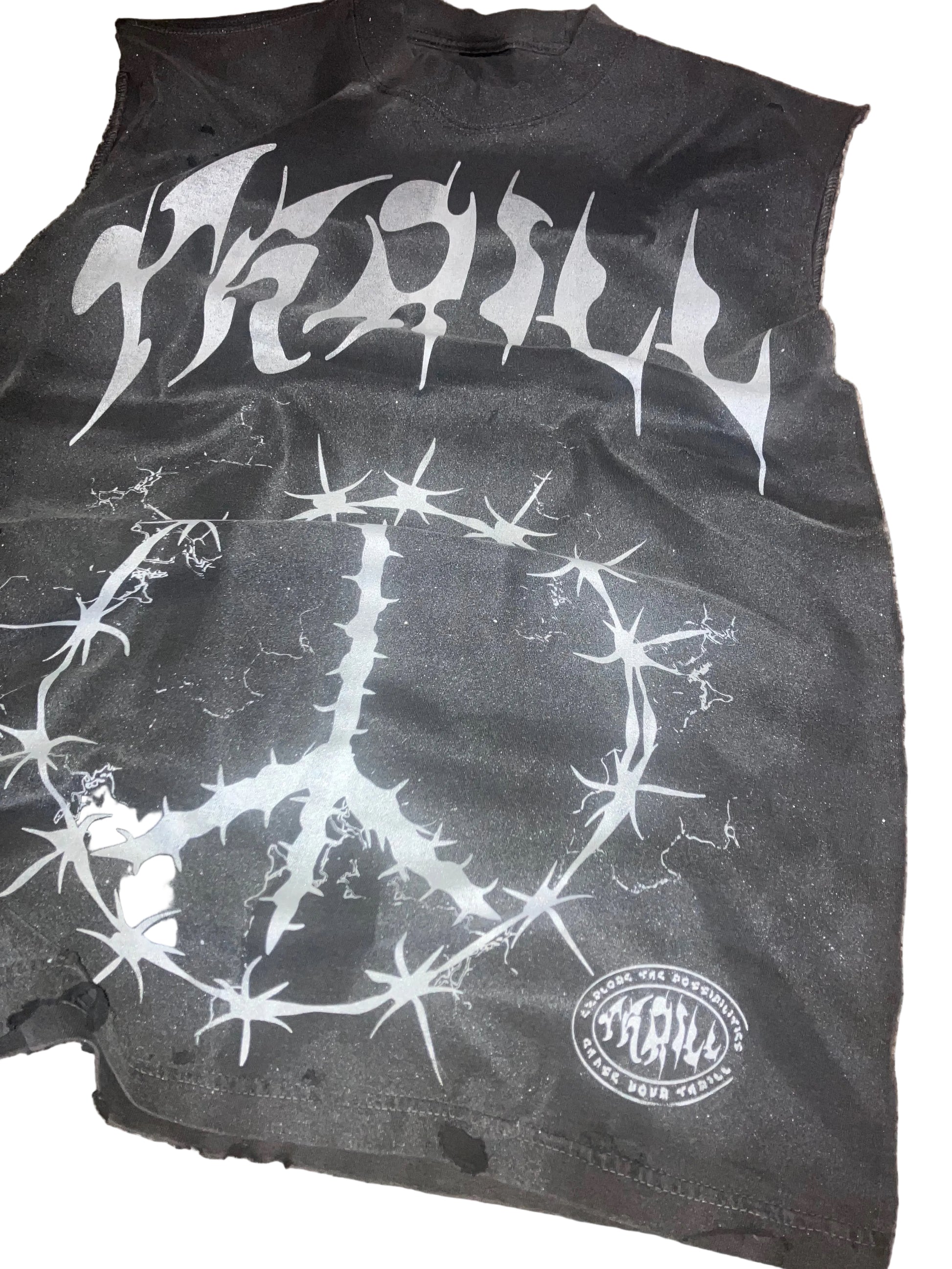 Raw, defiant, and unapologetically bold— This piece carries a gritty, charged energy—built around a reworked peace symbol wrapped in sharp, thorn-like wire. The design blends tension and balance, giving it that raw contrast between chaos and control. Lightning-style distress marks and subtle splatter textures add movement, making the graphic feel alive instead of flat.